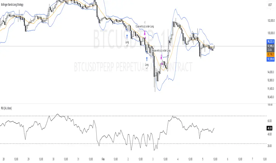 This strategy is designed for identifying and executing long trades based on Bollinger Bands and RSI. It aims to capitalize on potential oversold conditions and subsequent price recovery.