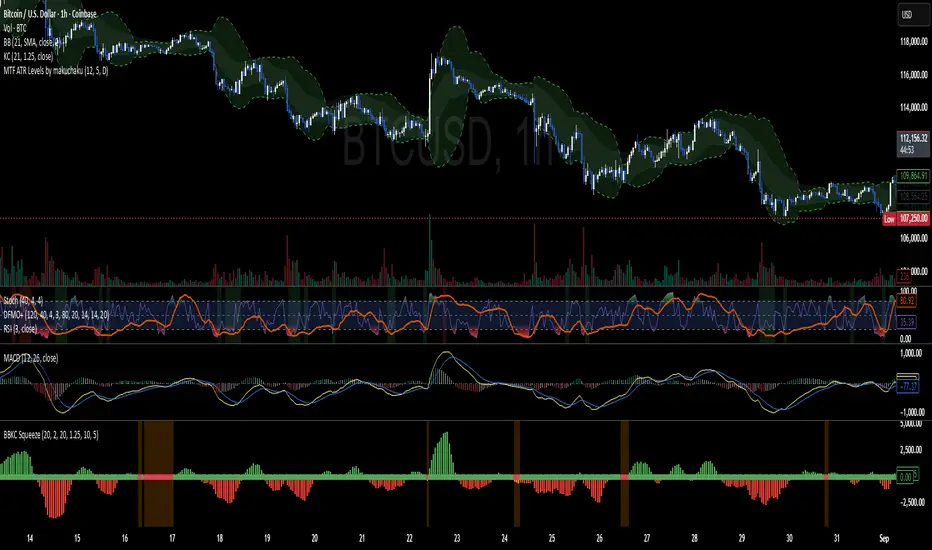 Bollinger Keltner Squeeze Indicator (BBKC)This single-pane indicator combines the power of Bollinger Bands (BB) and Keltner Channels (KC) to accurately identify periods of low volatility compression—the famous Squeeze—which often precedes large, directional moves.Designed for traders utilizing Accumulation, Manipulation, Distribution (AMD) strategies, this tool makes spotting the 'Accumulation' phase simple and visually clear, perfect for high BTC Beta equities or futures markets like MES and MNQ.Key Features:Clear Squeeze Visualization:The background of the main chart is shaded Orange when the Squeeze is active (BB is inside KC). This immediately highlights periods of extreme compression.A simple Red/Green Dot below the chart confirms the Squeeze state (Red = Squeeze ON, Green = Squeeze OFF).Momentum Histogram:A built-in momentum oscillator smooths price action and guides the anticipated direction of the breakout.Teal/Orange Bars: Indicate momentum direction while the Squeeze is active (building pressure).Bright Green/Red Bars: Indicate momentum direction after the Squeeze has broken (expansion/breakout).How to Find Maximum Volatility Compression (The "Tightest" Squeeze)To align this indicator with a strategy focused on catching only the most extreme volatility compression—the key to those explosive moves—traders should adjust the Keltner Channel Multiplier setting.Setting Name: KC Multiplier (ATR)Default Value: 1.5Recommended Adjustment: To filter for only the absolute tightest squeezes (where price is least volatile), decrease this multiplier value, typically down to 1.25 or even 1.0.By lowering the KC Multiplier (ATR), you narrow the Keltner Channel boundaries. This requires the Bollinger Bands to compress even further to fit inside, ensuring the indicator only signals the Squeeze state during moments of truly minimal volatility, setting you up for maximum opportunity.
