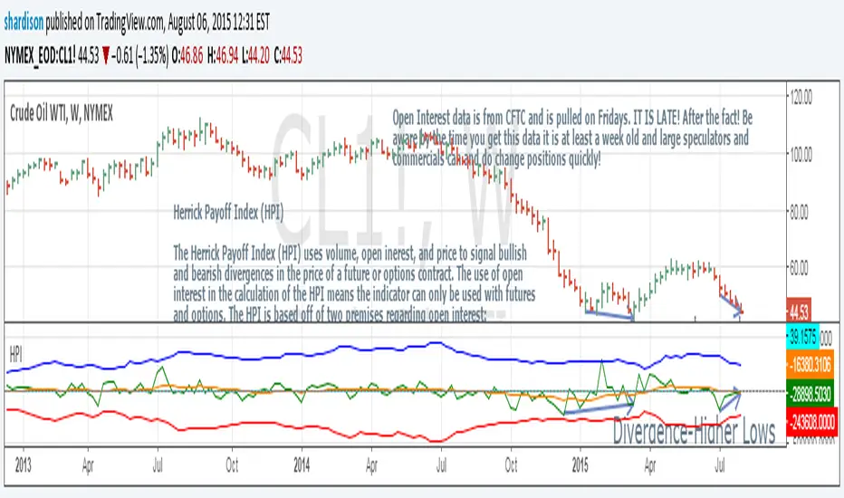 The Herrick Payoff Index was developed by John Herrick.When the Herrick Payoff Index is above zero, it shows that money is flowing into the futures contract (which is bullish). When the Index is below zero, it shows that money is flowing out of the futures contract (which is bearish).