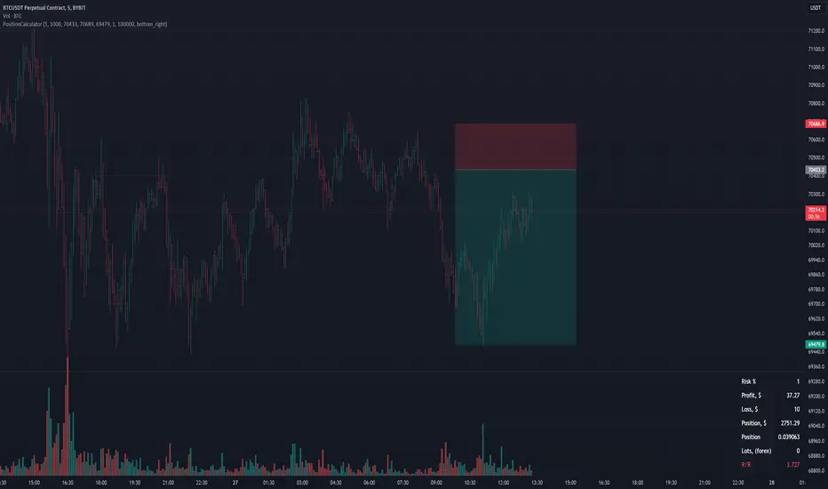 PositionCalculator is a simple position calculator that helps to calculate position size or lot size based on custom settings. The calculation result is presented as a table on the chart screen.