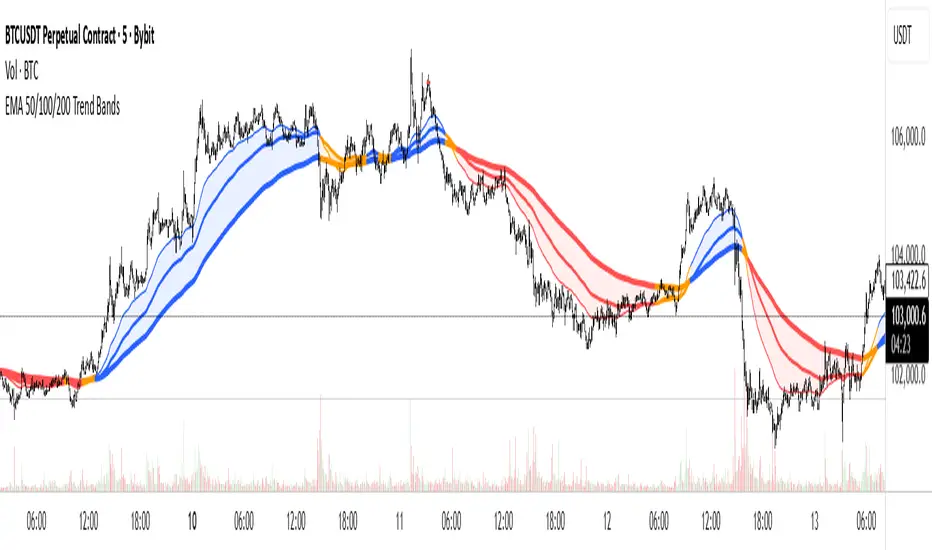 EMA Trend Bands is a clean and powerful trend-structure tool built around the classic 50/100/200 EMA stack.