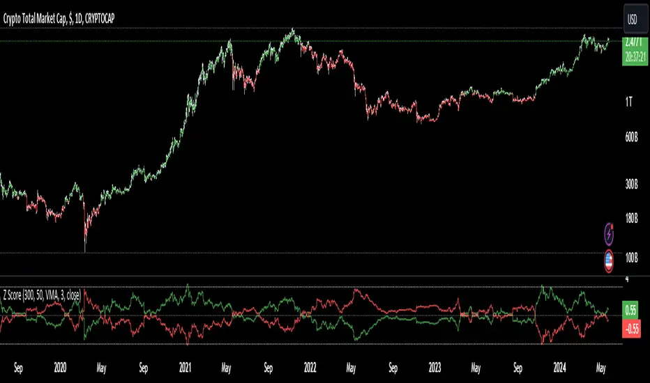 The Z Score & Trend Following indicator is a tool used in financial markets to assess the standard deviation of a data point from its mean value over a specified period. It calculates the Z score, which is a measure of how many standard deviations an element is from the mean. This indicator also incorporates trend-following characteristics, allowing traders to visualize trends based on the Z score.