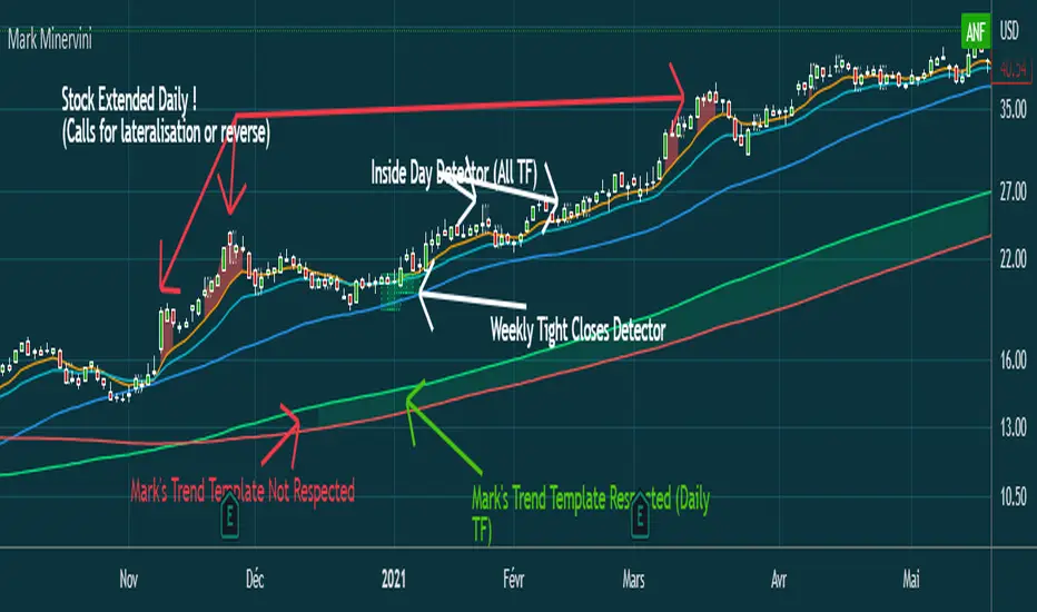 - Shows when Mark Minervini's trend template is respected by highlighting green between 150 & 200 SMA.
