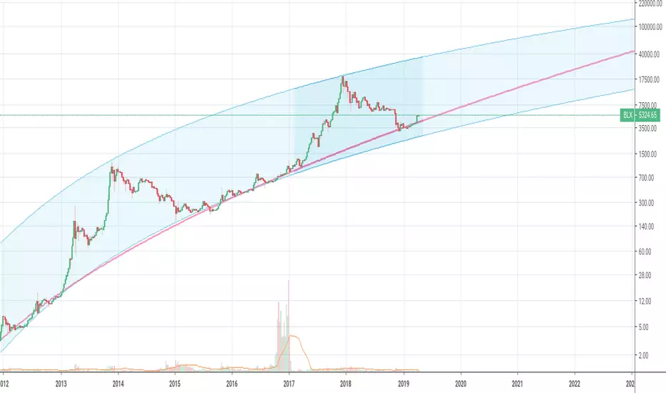 The blue channel is nothing more than a curve function that seems to "fit well" the historical prive of bitcoin, while the pink curve actually has some pretty solid theory behind it ;)