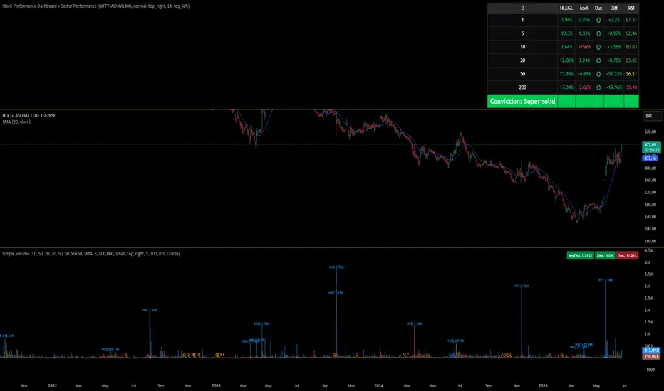 Displays the stock’s returns over multiple timeframes (1, 5, 10, 20, 50, 200 days) and compares them to a selected benchmark index (default: NIFTYMIDSML400).