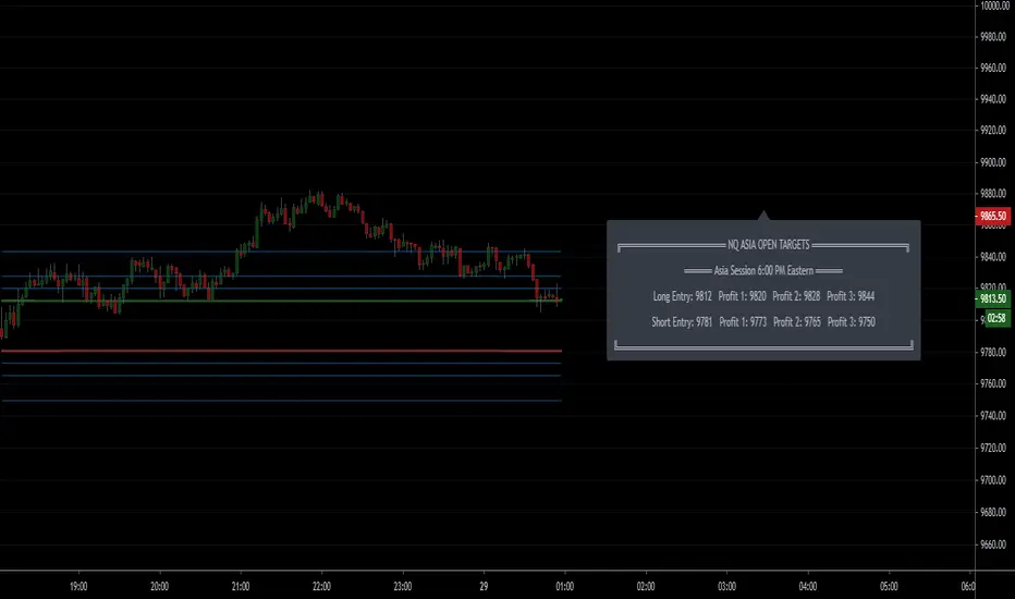 The lines and the text box are updated after the first 1 MINUTE bar closes for Asian session. The Asian session open is defined as 6:00PM - 6:01PM, Eastern time.
