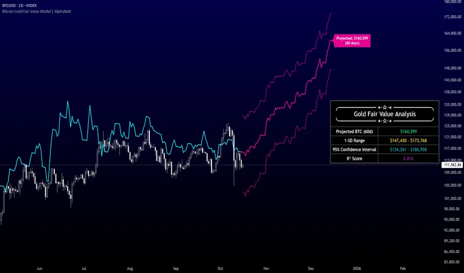 A quantitative regression-based projection model that estimates Bitcoin’s fair value using gold as a macro-monetary benchmark.