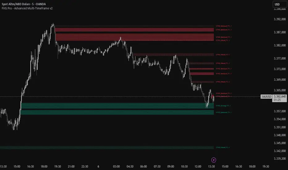 Enable the timeframes you want, set your visual preferences, and use the quality filter if you wish to highlight only the strongest imbalances. FVGs can be used as potential support/resistance or reaction zones—combine with your own trading strategy.