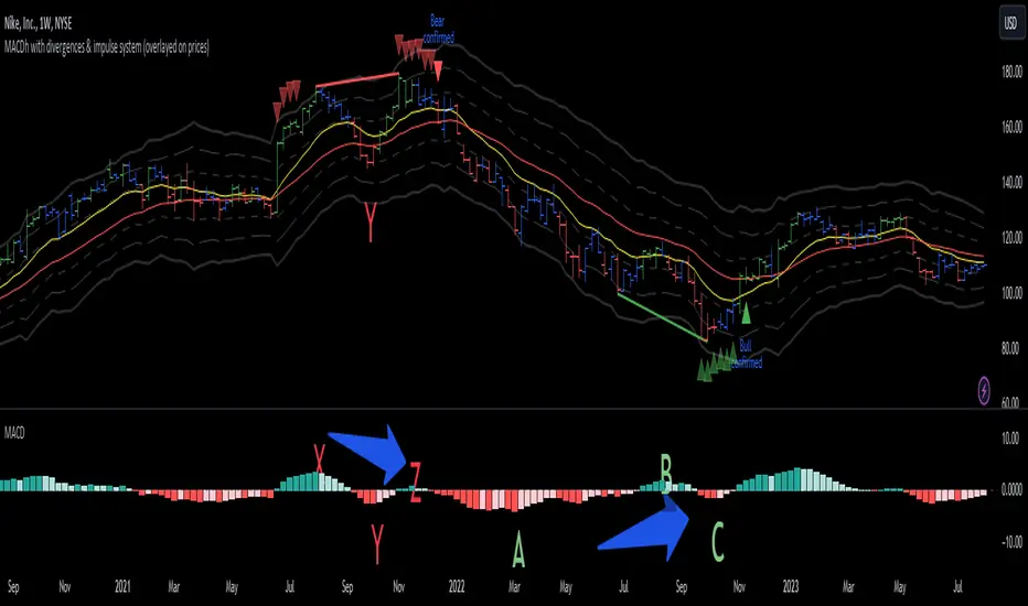 MACDh with divergences & impulse system (overlayed on prices)