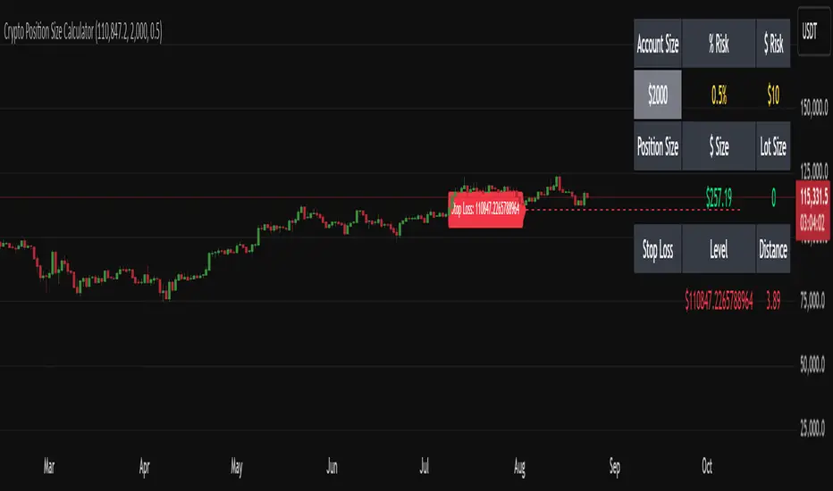 Position Size Calculator for Crypto.This indicator uses the current price and a selected stop loss to calculate your position size without having to work it out elsewhere!