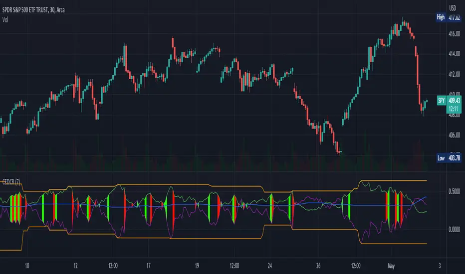 CEDCR is a momentum and trend analysis script, visualized by a pair of lines (Top and Bottom) that signal strength and direction of upcoming moves. The lines tend to converge and diverge around a midpoint line of 0.31-0.33 (the midpoint line is slightly different depending on the asset class). When the lines are converging it signals trend reversal and when they are diverging it indicates strength.