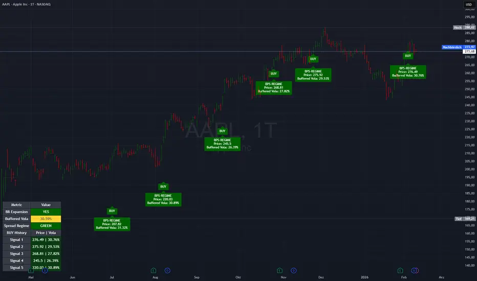10. Displays an on-chart dashboard and signal history, including regime status, buffered volatility, and recent buy signals for structured decision-making.