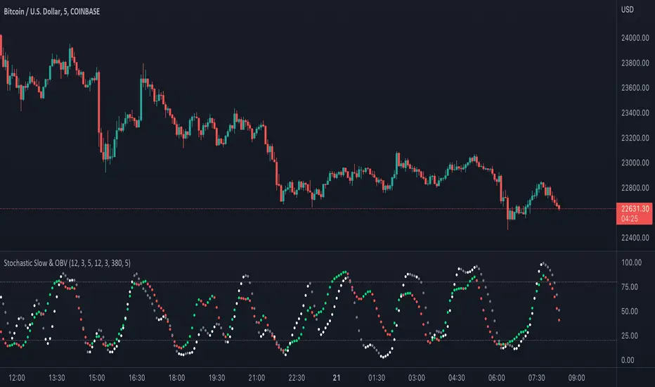 1. Dot color indicates the whether the stochastic K/OBV is over or below the stochastic D/Signal line.