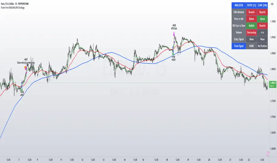 The entry method in the Forex Fire EMA/MA/RSI Strategy combines several conditions across two timeframes. Here's a breakdown of how entries are determined: