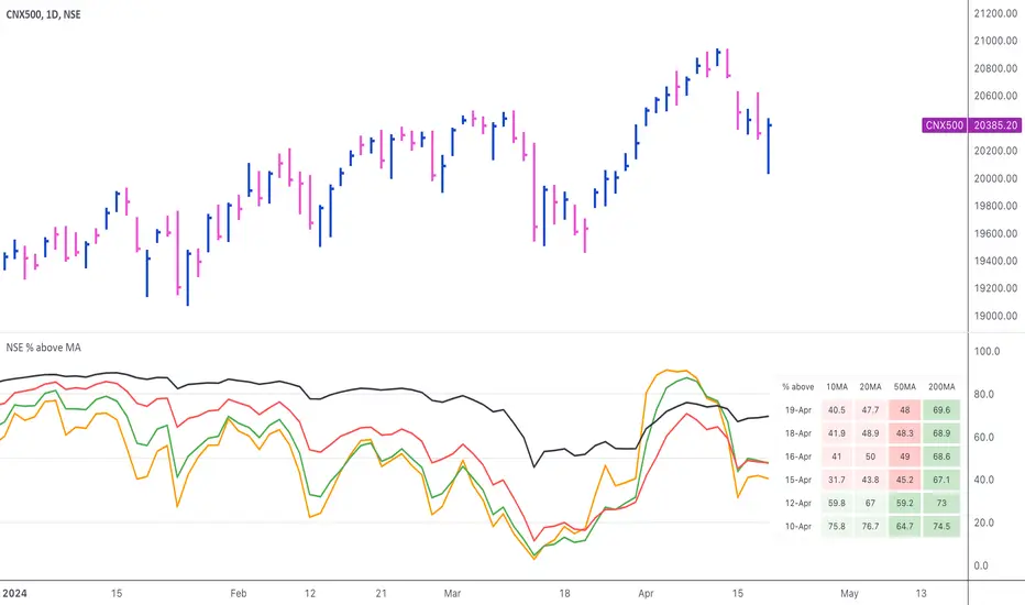 This indicator displays the percentage of NSE (India) stocks trading above key moving averages.