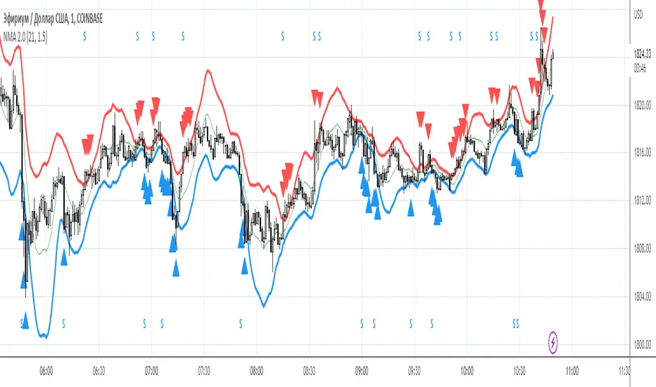 Indicator «NMA» is used to determine the divergence points between current prices and their fair (theoretical, calculated) values. Presence of strong divergence is a signal that prices have entered overbought/oversold zone. This, in turn, is a basis for position opening opposite to the current price dynamics.