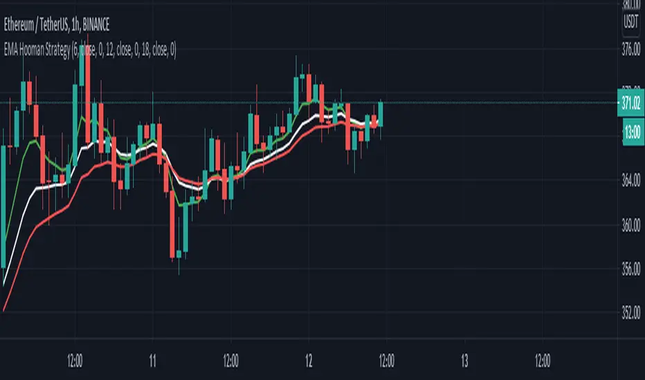 The "EMA Hooman Strategy" indicator contains 3 Moving Average Exponential with 6, 12 and 18 lengths along with close source, which can be used as a LONG or SHORT trading strategies.