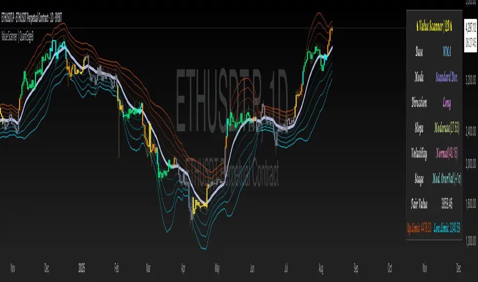 The Value Scanner by QuantEdgeB is a volatility-adaptive valuation framework that dynamically evaluates where price sits relative to a custom โFair Valueโ zone. It combines your choice of moving average engine (SMA, WMA, VIDYA, etc.) with multi-layered standard deviation or ATR-based bands to highlight extreme conditions, reversal zones, and statistical overextensions in real time.