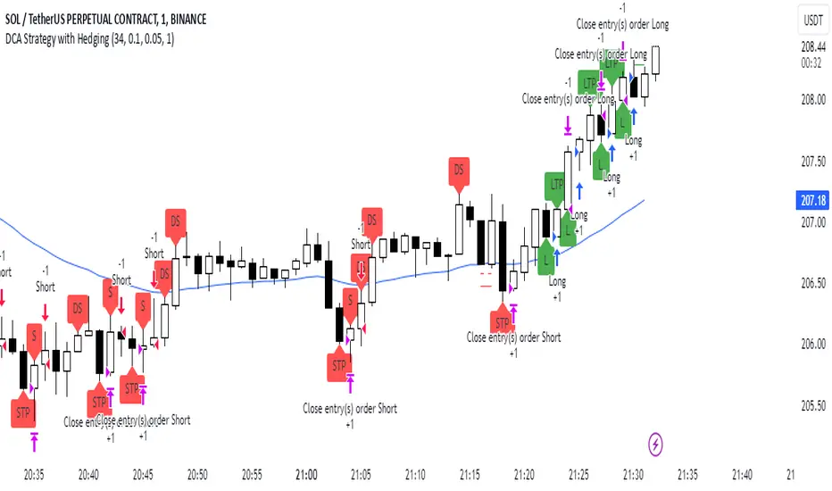 This strategy implements a dynamic hedging system with Dollar-Cost Averaging (DCA) based on the 34 EMA. It can hold simultaneous long and short positions, making it suitable for ranging and trending markets.