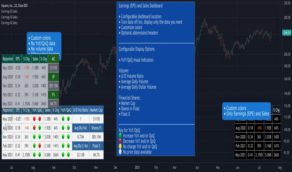 View quarterly earnings per share (EPS) and sales data. Optional visual icons can be shown comparing data on a Year-over-Year (YoY) and/or Quarter-on-Quarter (QoQ) basis.