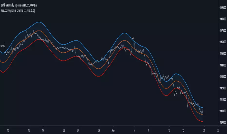 Back when i started using pine i made a script called periodic channel who aimed to rescale an average correlated sine wave to the price...don't worked very well. So i tried to fix problems induced by the indicator without much success, i had to redo it from scratch while abandoning the idea of rescaling correlated smooth functions to the price, at that time i also received requests regarding polynomial channel, some plateformes included this indicator, this led me to the idea to estimate it in order to both respond to the periodic channel problems and the requests i received, i have tried many many things and recently i tweaked a linear extrapolation to have an approximation.