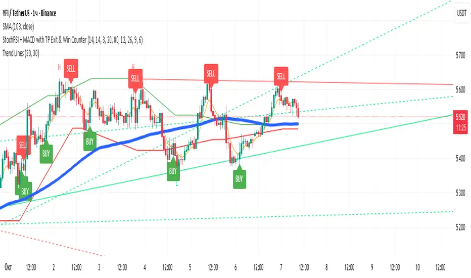 This indicator combines signals from Stochastic RSI and MACD with optional trend filtering via EMA. It implements a transparent trading logic with fixed profit exits, visual labels, and automatic alerts. Recommended for use on the 1-hour timeframe (1H) for optimal signal accuracy.