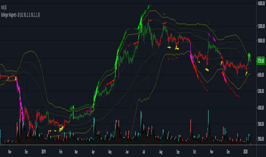 As tated in my "Deviation Magnet" script, contrary to the popular use where price is seen as BOUNCING AGAINST the different deviations (or upper and lower BBands),