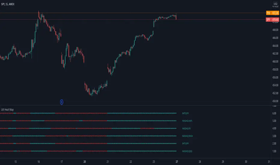 The Litt Heat Map allows you to see the MA Line for multiple symbols on 1 chart! You can use the Heat Map as a scanner to see when trend has changed, or as a trend confirmation tool when multiple symbols are aligning.