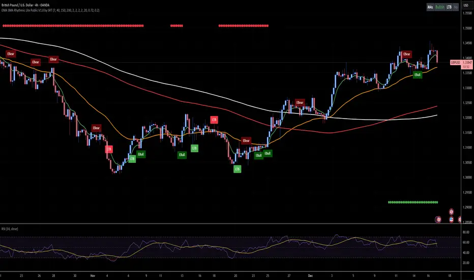 A clean, lightweight trend-rhythm engine designed for traders of all levels. Built on a robust combination of EMAs and SMAs, this indicator provides clear directional bias signals while remaining fully non-repainting.
