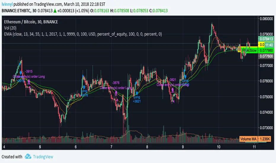 This is a pretty simple strategy that uses three exponential moving averages (fast, normal, and slow) and enters a long position when the fast EMA is above the normal EMA and the normal EMA is above the slow EMA. The position will be closed once the inverse is true (slow is above normal and normal is above fast).