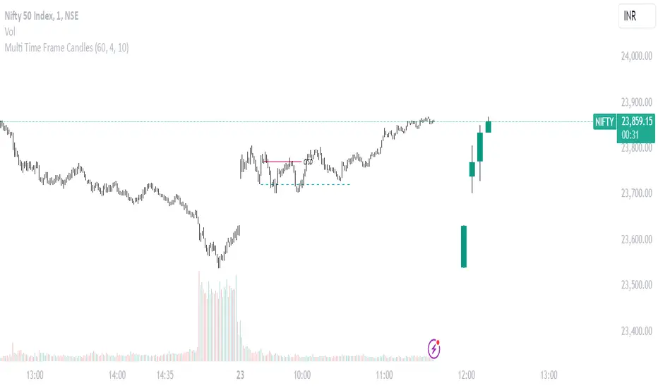 "Brijesh TTrades candle plot" is a powerful and customizable indicator that allows you to overlay higher timeframe candles directly on your chart. Choose your desired timeframe (e.g., Daily, Hourly) and plot up to 10 recent candles with precise control over color, wick style, and width. The candles are offset by 40 bars to the right, providing a clear and unobstructed view of the current price action. Ideal for multi-timeframe analysis and gaining deeper insights into market trends.