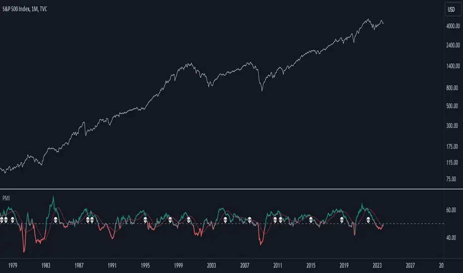 When the crossedUp condition is met (PMI crosses the first SMA from top to bottom while above 52), a skull emoji (indicating potential danger) is plotted at the top of the indicator window.