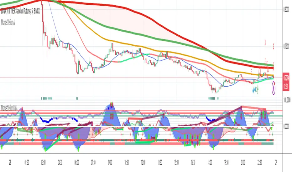 Converted to Pine Version 4 - Unfortunately V4 allows less outputs so I have had to remove Divergences from Oscillator 1 and Most Alerts - Alerts can still be found in MarketVision AUpdated settings Menu to make it more user friendly (Thanks to Pine V4)