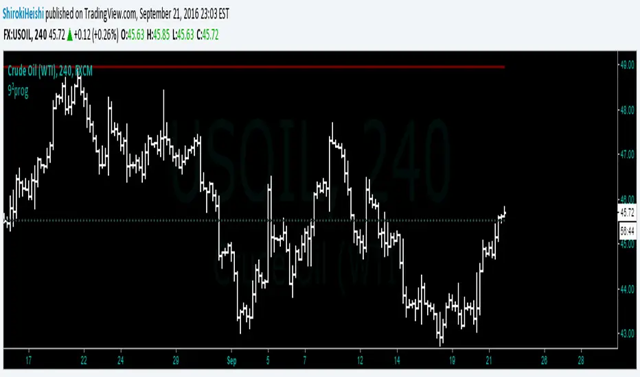 This is my attempt at progressions along the Gann wheel. Theoretically this script advances a numeral 45 degrees along the square of nine. The degree chosen (negative for bearish projections) can of course be customized and further subdivided as per your needs, but there is a slight flaw in the calculations that I am asking the community to take a look at, hopefully you all can give me a hand here. While the majority of the figures are correct, there seems to be some very slight discrepancies in the prices projected. If you are a Gann user, then you know how accurate they can be and as such, the discrepancies are not tolerable. Take a peek and let me know what you see that I am missing. Hope this script becomes helpful for all users.