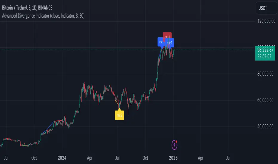 Unlock the full potential of your trading strategy with the Advanced Divergence Indicator, a powerful tool designed to identify and analyze bullish and bearish divergences using multiple technical indicators. Whether you're a seasoned trader or just starting out, this indicator provides clear, actionable signals to help you make informed trading decisions.
