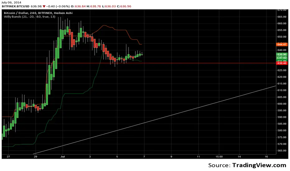 Reverse engineered Willy21Ema13 to show (on chart) the levels price would have to reach to be overbought/oversold given recent price history.