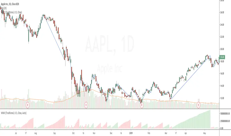 This indicator is based on the Weis Wave described by David H. Weis in his book Trades About to Happen: A Modern Adaptation of the Wyckoff Method, more info how to use this indicator can be found in this video. The Weis Wave is an adaptation of Richard D. Wyckoff’s method Wave Charts. It works in all time periods and can be applied to all asset types.