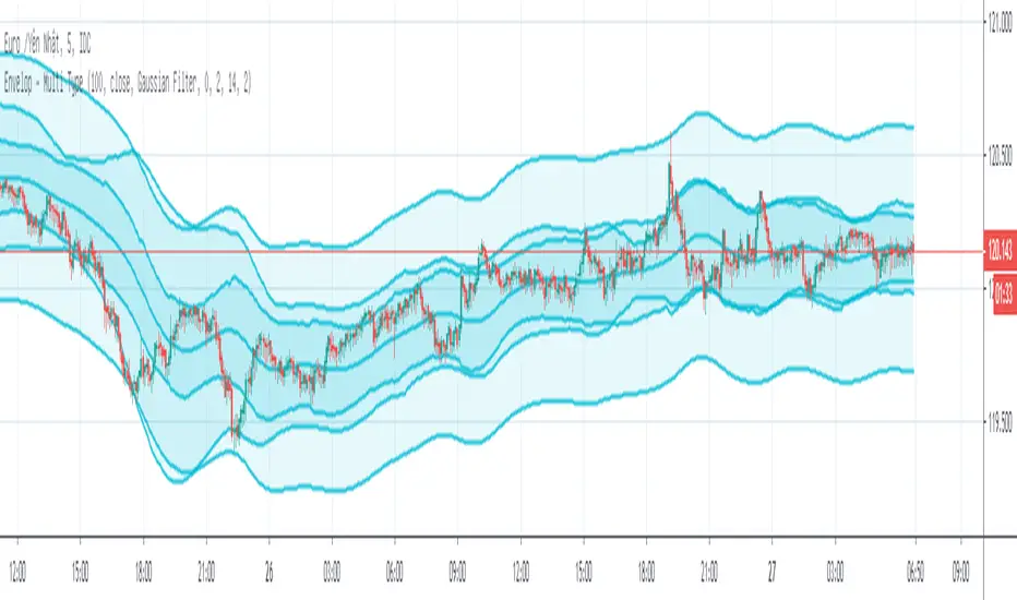 Envelop - Multi Type displays an upper envelope above a basis line and a lower envelope below the basis line. The basis line is a type of moving average, The envelopes are set a percentage away from the basis line.