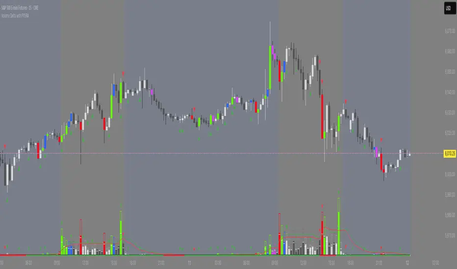 Volume Delta with PVSRA is an advanced volume indicator that dissects each bar’s volume into its directional components using higher resolution data. It visually distinguishes between buying and selling volume, so that for a bullish candle the bottom portion represents buying volume and for a bearish candle it represents selling volume. A dot is plotted at the 50% mark of the candle’s total volume, serving as a clear reference point.