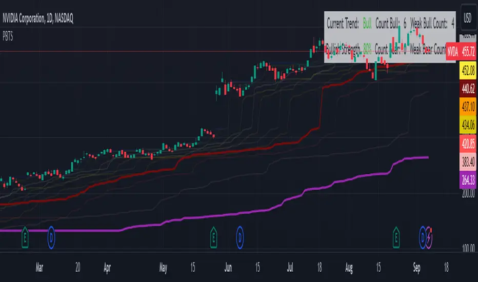 The "Percentile Based Trend Strength" (PBTS) calculates trend strength based on percentile values of high and low prices for various length periods and then identifies the current trend as either Bullish, Bearish, or N/A (No Trend). Here's a step-by-step explanation of the code: