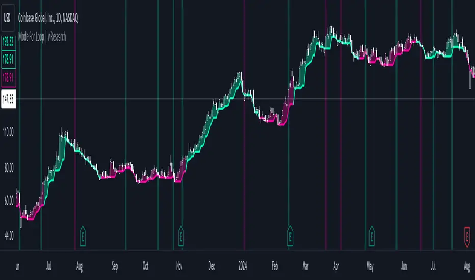 The "Mode For Loop | viResearch" indicator offers a powerful combination of mode-based price smoothing and dynamic trend scoring, giving traders a detailed and responsive tool for trend analysis. By incorporating this script into your trading system, you can improve your ability to detect and confirm trends while minimizing the impact of market noise. Whether you're focused on capturing early trend reversals or confirming ongoing trends, this indicator provides a reliable and flexible solution.