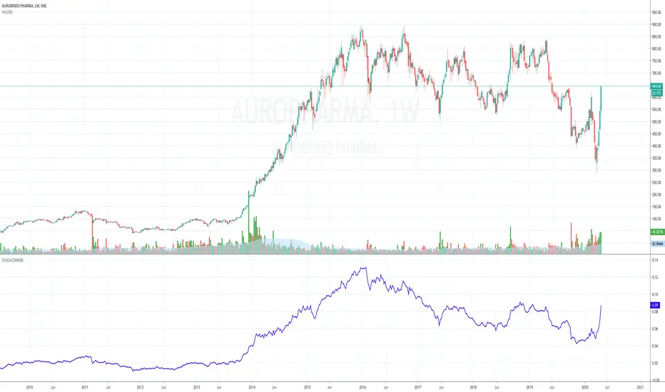 This indicator gives the relative performance or spread between the security, defaulted to the selected one for the price chart, and the broader Indian Nifty CNX500 index.