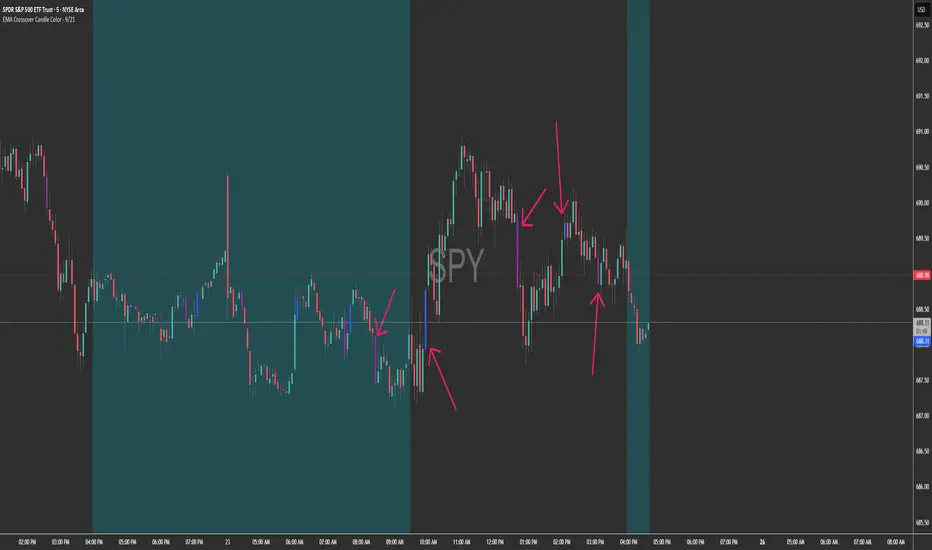 A simple visual trend highlighter for intraday/day trading. This overlay indicator plots a fast 9-period EMA (orange) and a slower 21-period EMA (blue). Candles turn green on the exact bar where the 9 EMA crosses above the 21 EMA (bullish momentum shift), and red when the 9 EMA crosses below the 21 EMA (bearish shift). Otherwise, candles remain default. Great for spotting quick trend changes, momentum entries, or filtering chop on 5-min charts (or any timeframe). Pairs well with VWAP, volume, or price action for confluence.