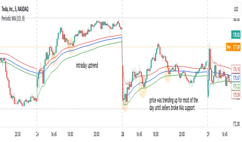 Indicator plots three simple moving averages (MA) that are reset at the beginning of period, specified by a user.