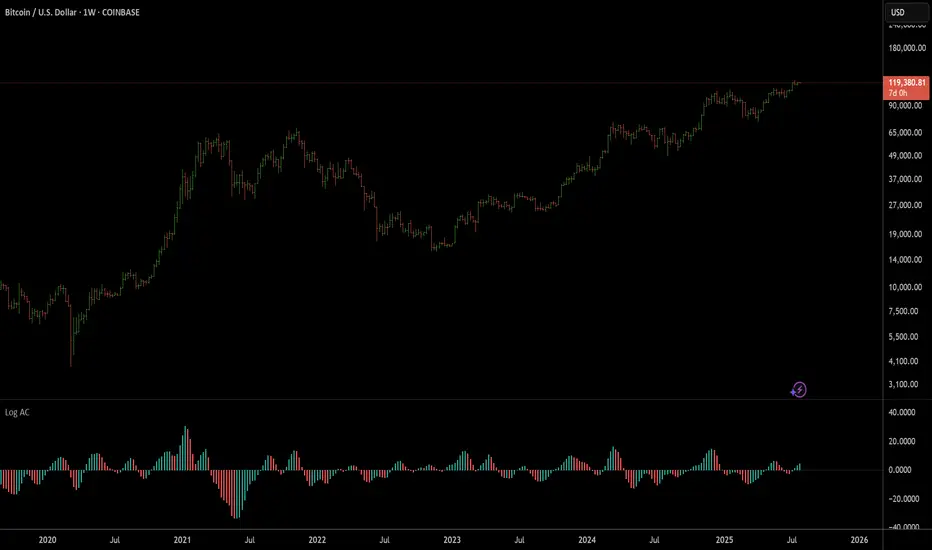 Useful for seeing the change in the speed of the momentum, particularly within the log-scaled AO. Works better than the original (non log) AC for long-term and volatile price action which exhibits logarithmic growth trends.