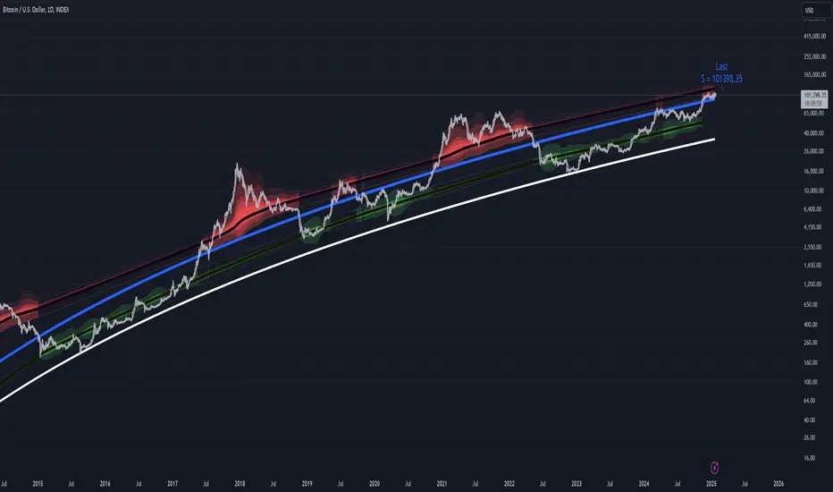 The Bimodal Power Law Model is a powerful TradingView indicator that provides a detailed visualization of Bitcoin's price behavior relative to its long-term power law trend. By leveraging volatility-normalized deviations, this model uncovers critical upper and lower bounds that govern Bitcoin’s price dynamics.