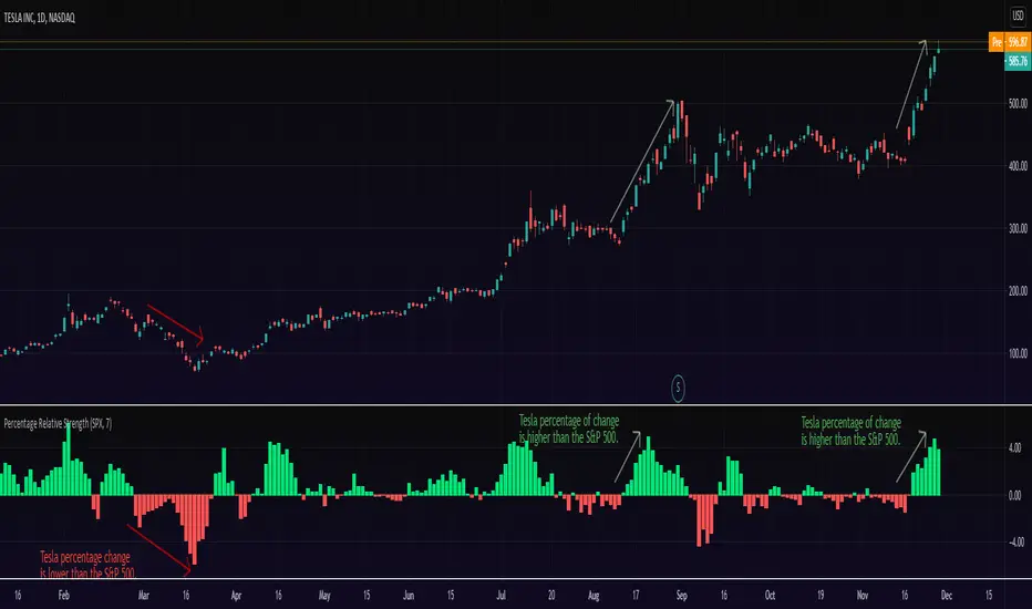 GREEN area (above zero) means TSLA is rising more than the SPX.