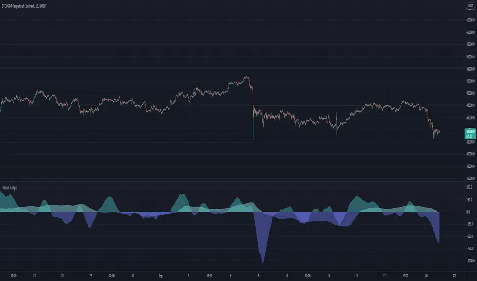 The Flow of Range is calculated by averaging the range for the given bars for the short term oscillations, then averaging the average to determine long term runs.
