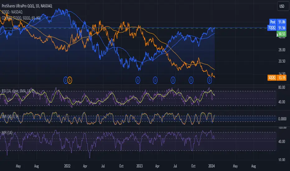 The Custom Dual SMA Indicator is designed for traders who wish to track and compare the moving averages of two different financial instruments simultaneously on the same chart, usually if there is correlation between to different asset such as TQQQ vs SQQQ. This indicator is particularly useful for those who engage in comparative analysis or pairs trading strategies.