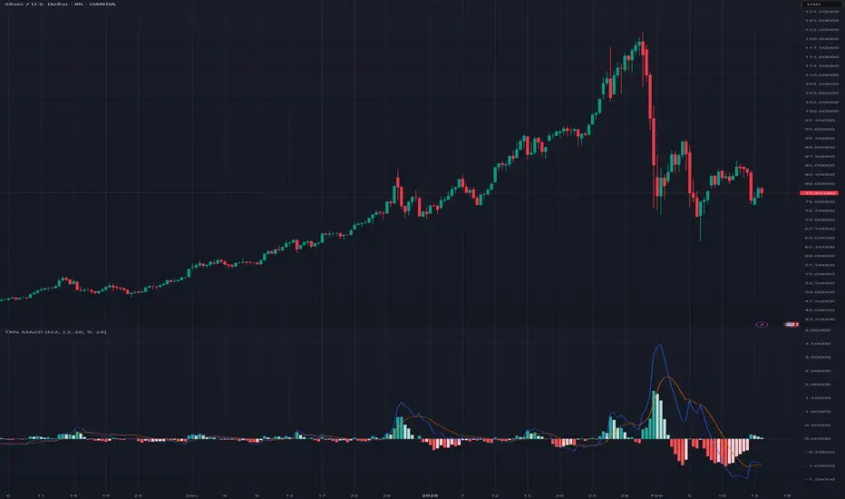 True Range Percentage MACD (TR% MACD) is a volatility-oscillator that measures relative range movement and applies MACD logic to identify volatility momentum cycles.